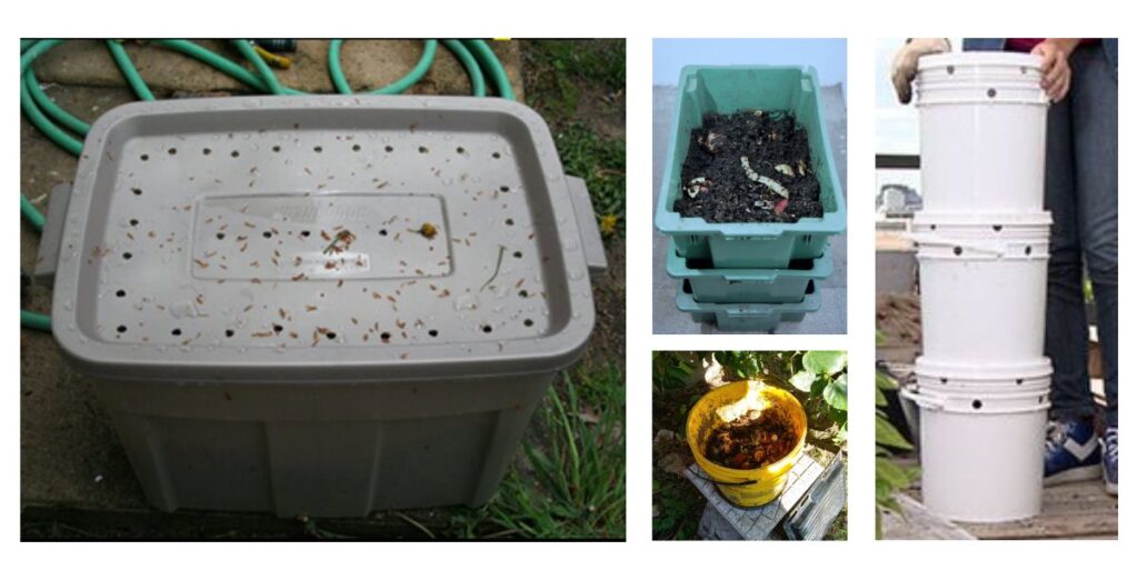 Para el caso de los que no tenemos un gran espacio en nuestro patio lo primero que necesitamos buscar es el recipiente adecuado. Podemos reciclar alguno que tengamos en casa, como nosotros que usamos esta caja plástica donde nuestros hijos guardaban sus juguetes. Solamente fue necesario hacerle un par de agujeros para proveerle drenaje y circulación de aire.